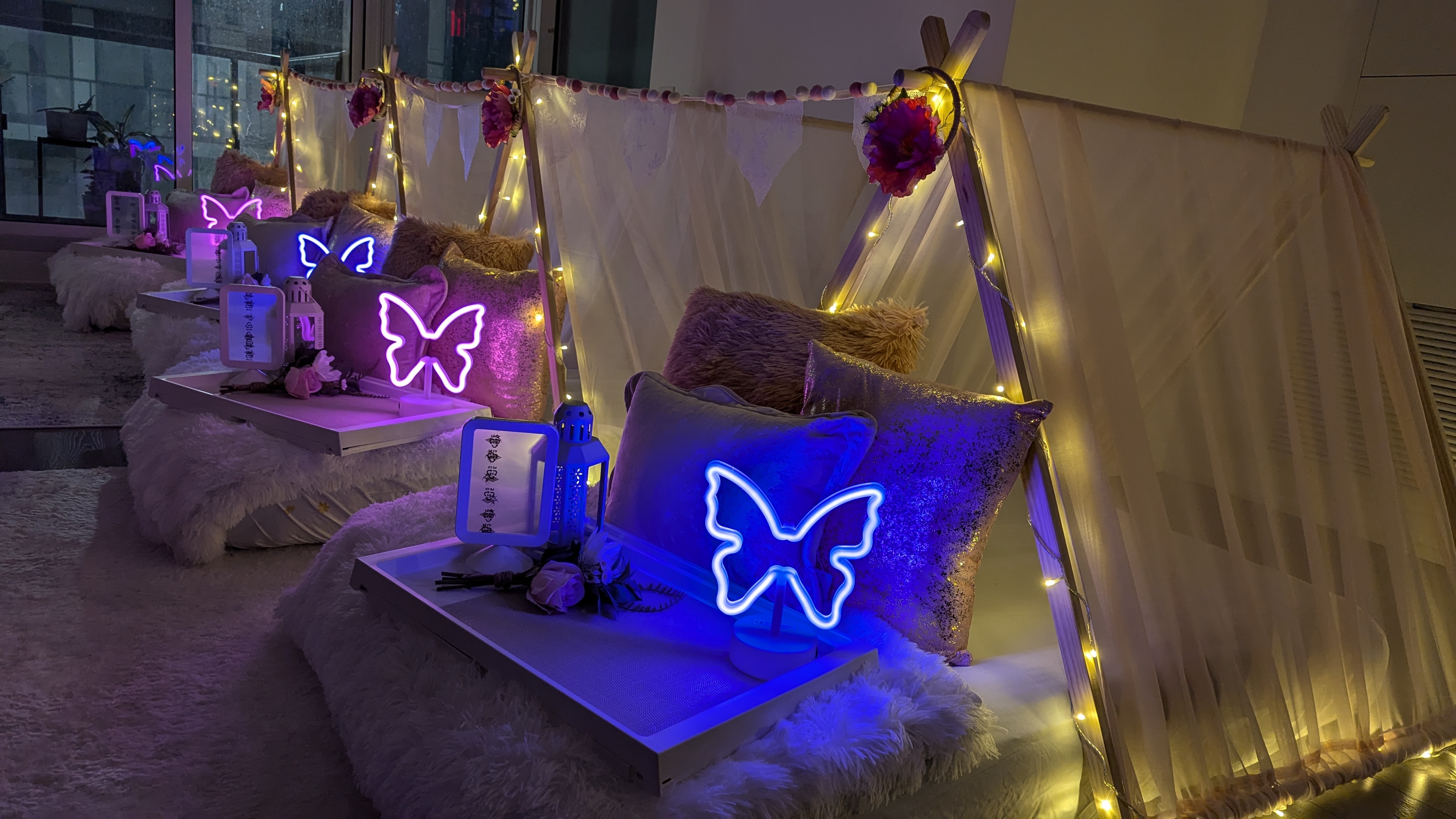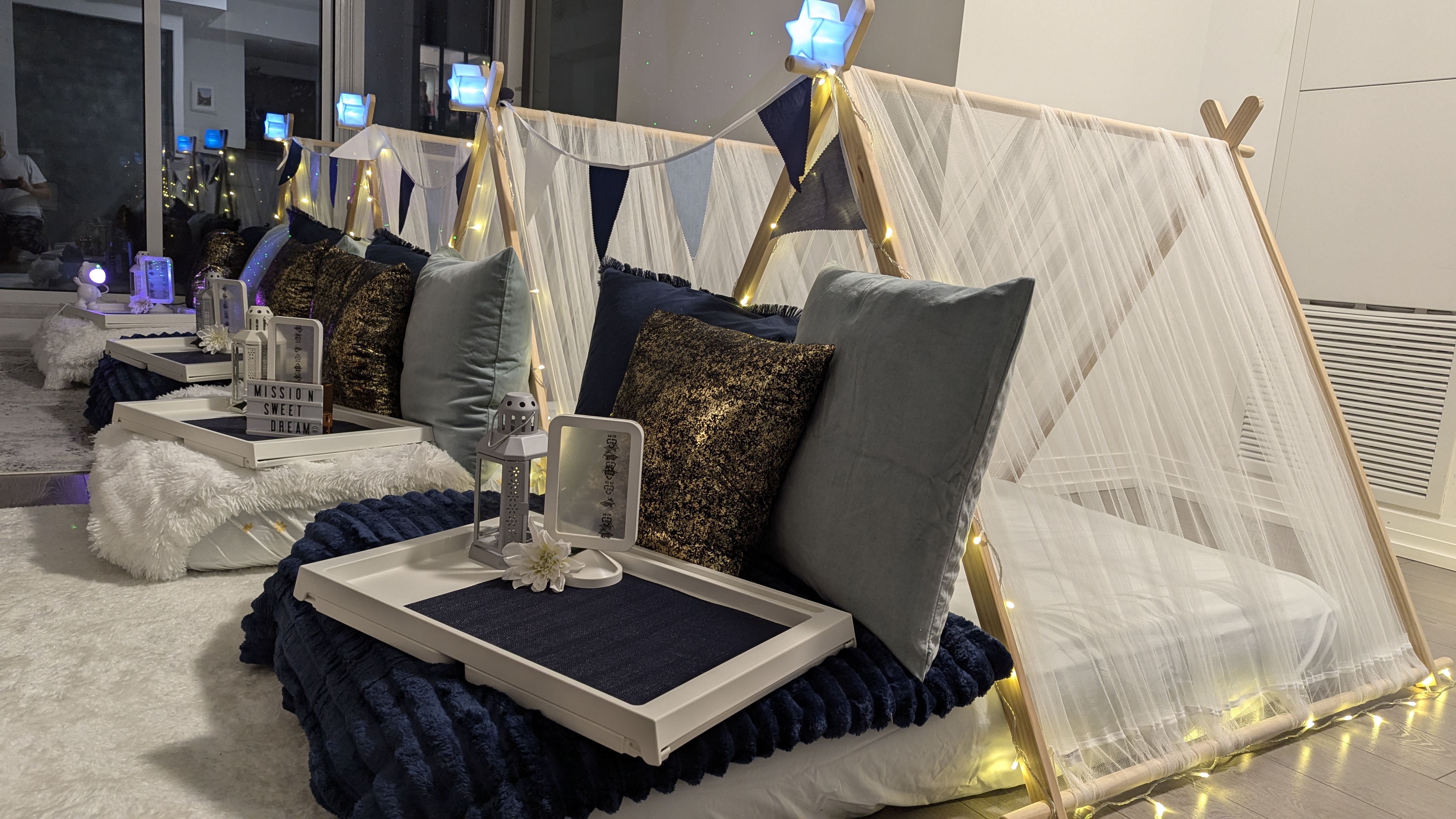 Space Requirements:For our magic to begin we approximately need 3×6 feet per Tent. To prepare for your enchanting sleepover experience, we kindly ask that the designated area be completely furniture-free and clean upon our arrival.