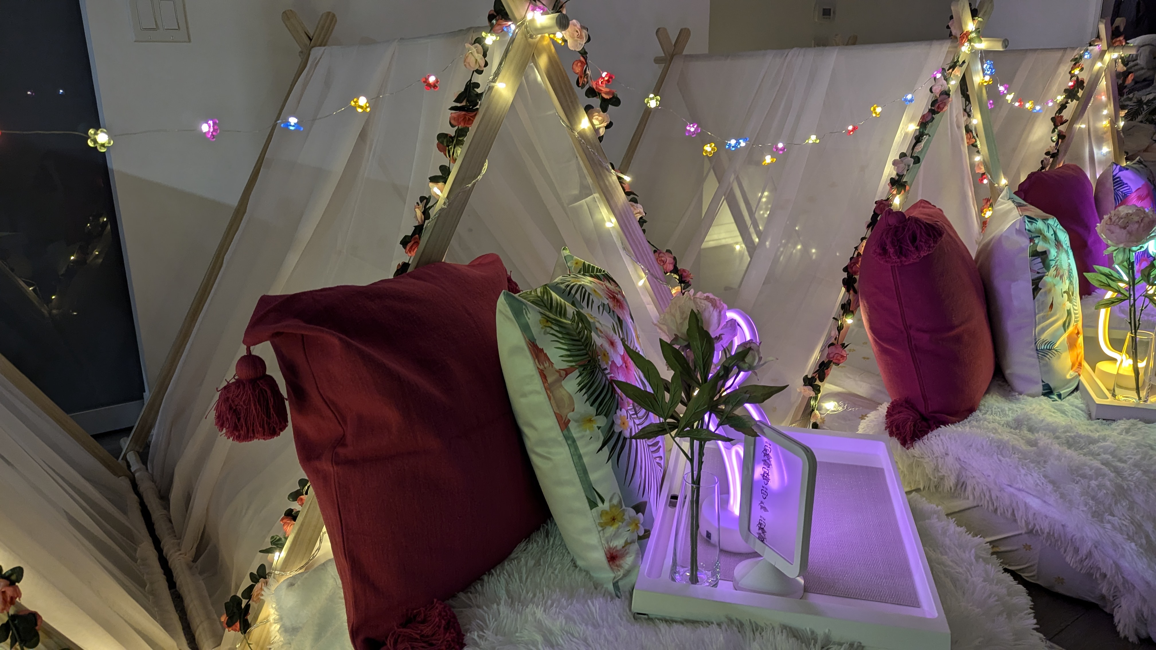 A floral dreamland of soft pink hues, twinkling fairy lights, and plush cushions. This enchanted retreat is perfect for little dreamers ready to let their imaginations blossom!