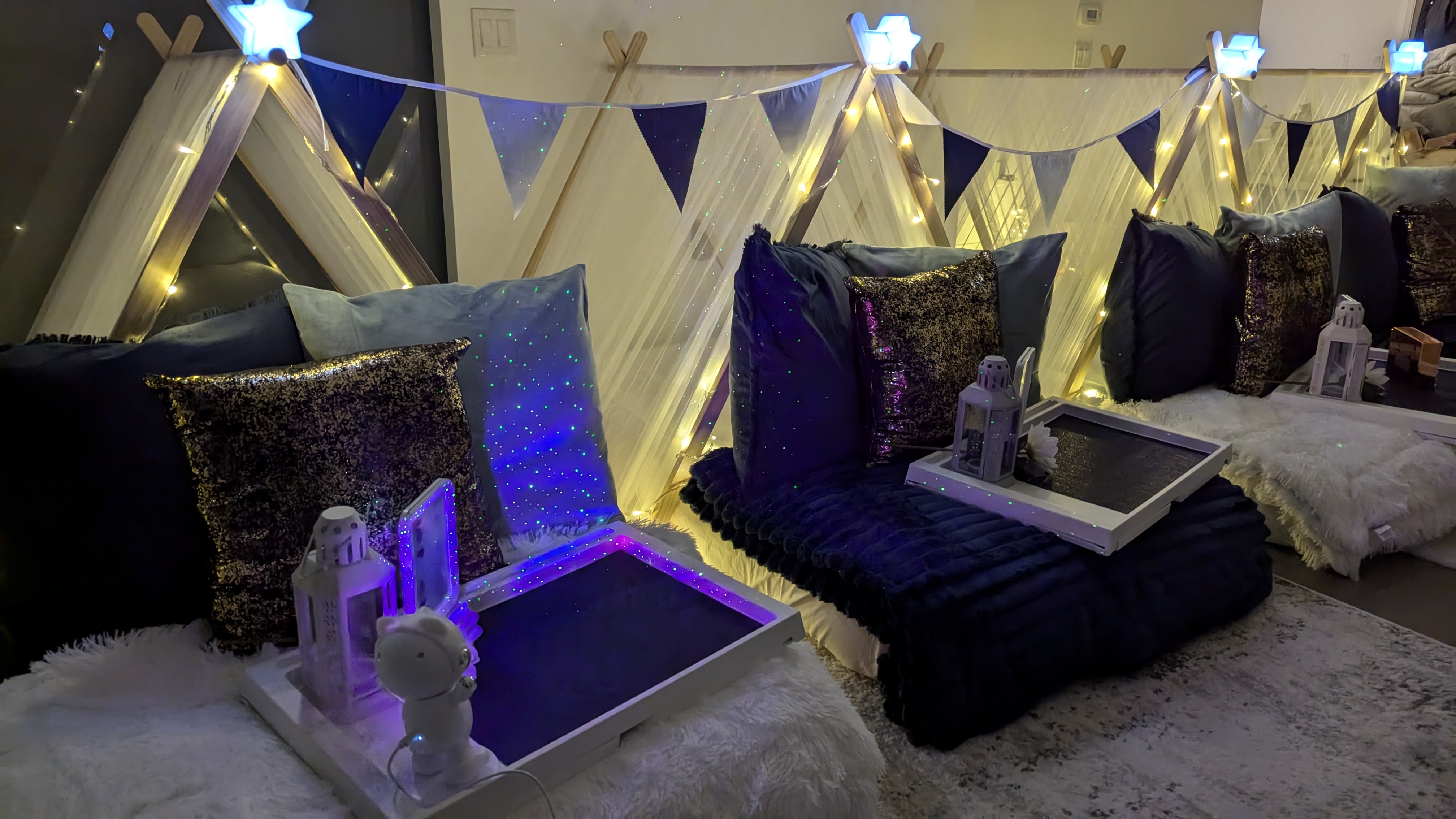 Blast off into a starlit adventure! With galaxy-inspired beds, glowing lights, and shimmering pillows, this cosmic sleepover turns bedtime into an intergalactic journey among the stars.